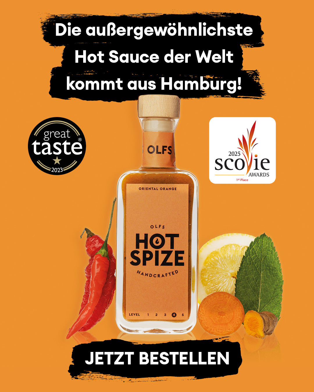 Mein erster Kontakt mit dieser außergewöhnlichen Sauce begann auf dem Weihnachtsmarkt Gut Bardenhagen, wo ich den Gründer "Olf" persönlich kennenlernen durfte. Ein super freundlicher Typ, mit einem offensichtlichen Sinn für leckere Saucen! Seine Begeisterung für Geschmack und Qualität spiegelt sich unmissverständlich in Olfs Hot Spize Oriental Orange wider.